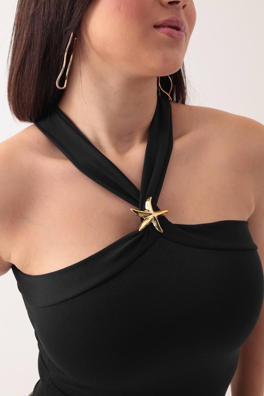 The garment has a sewn closure with a hook to avoid discomfort and double lining, providing safety in the bust area.